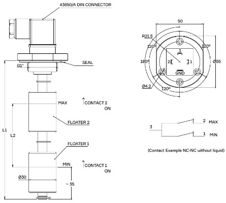 二つのフロートを備え、液面の上限と下限を検知できる電磁機械式レベルスイッチです 。