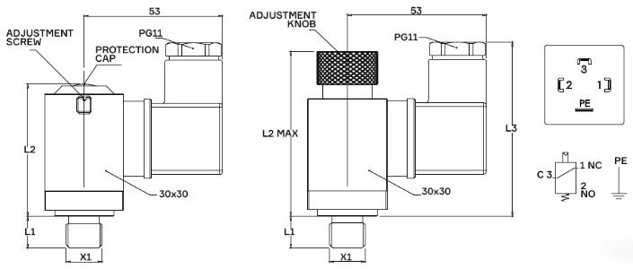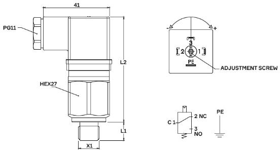 | 取付け部ネジ (X1) | 1/8"BSPP (L1 10 mm) 1/8"-27NPT (L1 10 mm) から選択 |