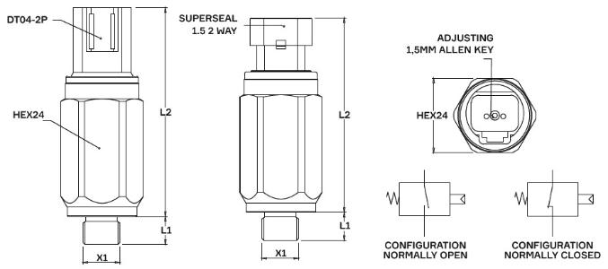 | L2寸法 | 61 mm / ダイヤフラム / AMP Superseal コネクタ 1.5シリーズ 64 mm / ピストン / AMP Superseal コネクタ 1.5シリーズ 64 mm / ダイヤフラム / Deutsch DT04-2P 67 mm / ピストン / Deutsch DT04-2P |