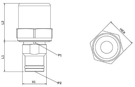 | 取付け部ネジ (X1) | 1/8"BSPT (L1 10 mm) 1/4"BSPT (L1 12 mm) 1/8"BSPP (L1 10 mm) 1/4"BSPP (L1 12 mm) M10x1 (L1 10 mm) M10x1K (L1 10 mm) M12x1.5 (L1 12 mm) 1/8"-27NPT (L1 10 mm) 1/4"-18NPT (L1 12 mm) から選択 |
